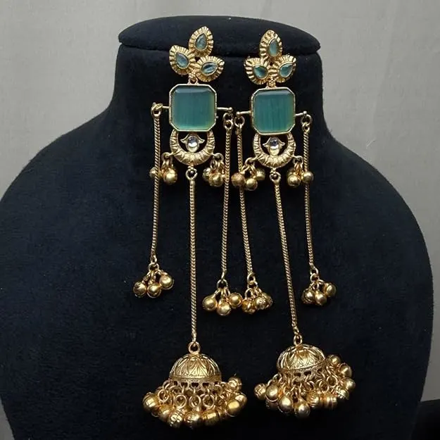 Traditional Gold-Plated Jhumka Earrings with Blue Stone