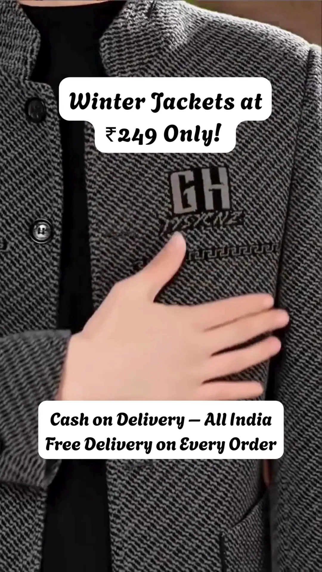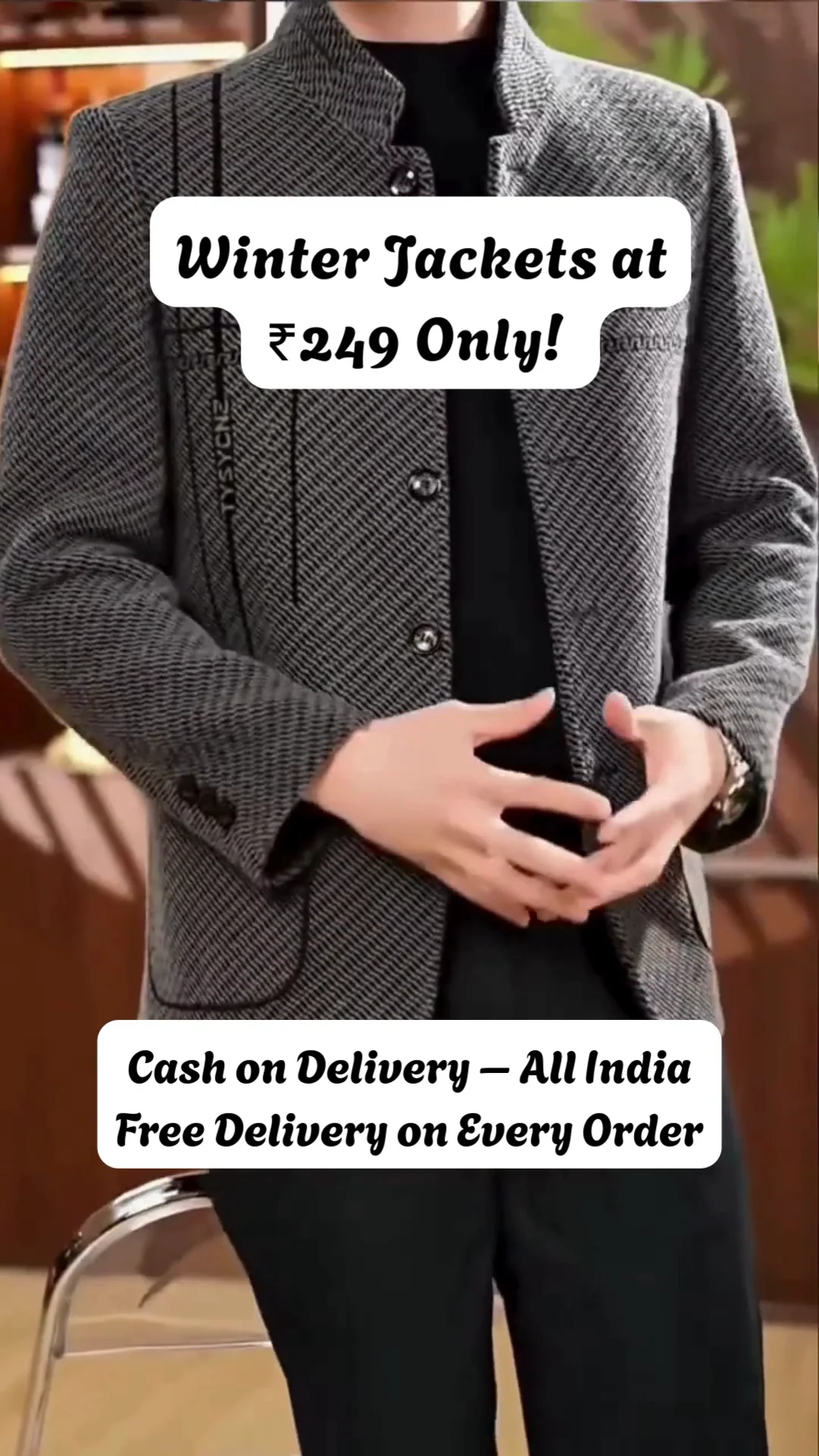 The promotional message highlights the jacket as an affordable winter essential at an attractive price point. With the added benefit of cash on delivery and free delivery across India, the product is positioned as a convenient and budget friendly choice. Overall, the image presents the jacket as a practical, stylish, and value driven option for winter wardrobes.