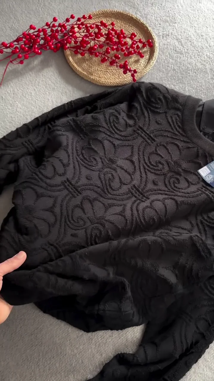 a stylish black winter sweater laid out neatly on a textured light grey surface, creating a clean and elegant presentation. The dark tone of the sweater contrasts beautifully with the background, instantly drawing attention to its design and fabric. The simple flat lay styling highlights the garment clearly, making it easy to appreciate its overall look and structure.