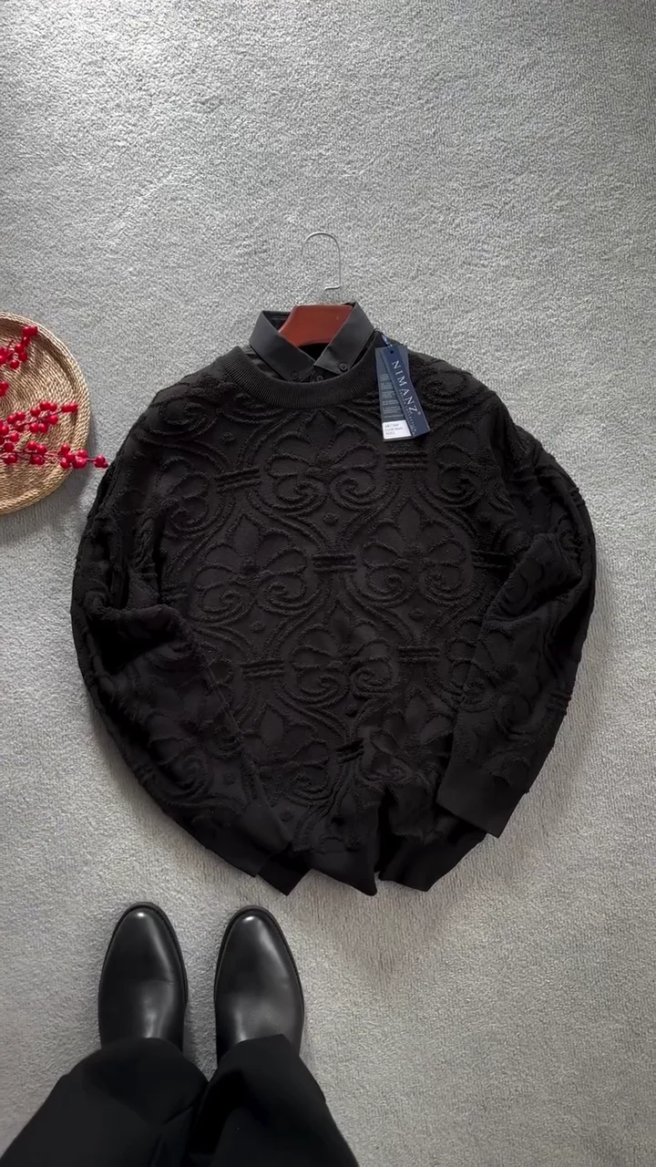 A classic round neckline with a layered collar detail enhances the sweater’s refined appearance. This design allows it to be styled easily with shirts underneath for a smart casual or semi formal look. The sweater appears well tailored, offering a balanced fit that suits everyday wear as well as special winter occasions.