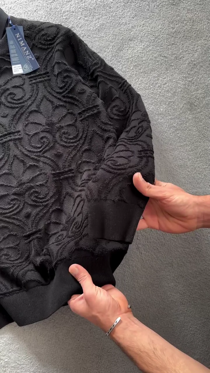The sweater stands out for its rich textured pattern, featuring intricate raised motifs across the fabric. This detailed design adds depth and a premium feel while keeping the overall look subtle and sophisticated. The full sleeves and ribbed cuffs suggest warmth and comfort, making it an ideal choice for winter wear without appearing bulky.