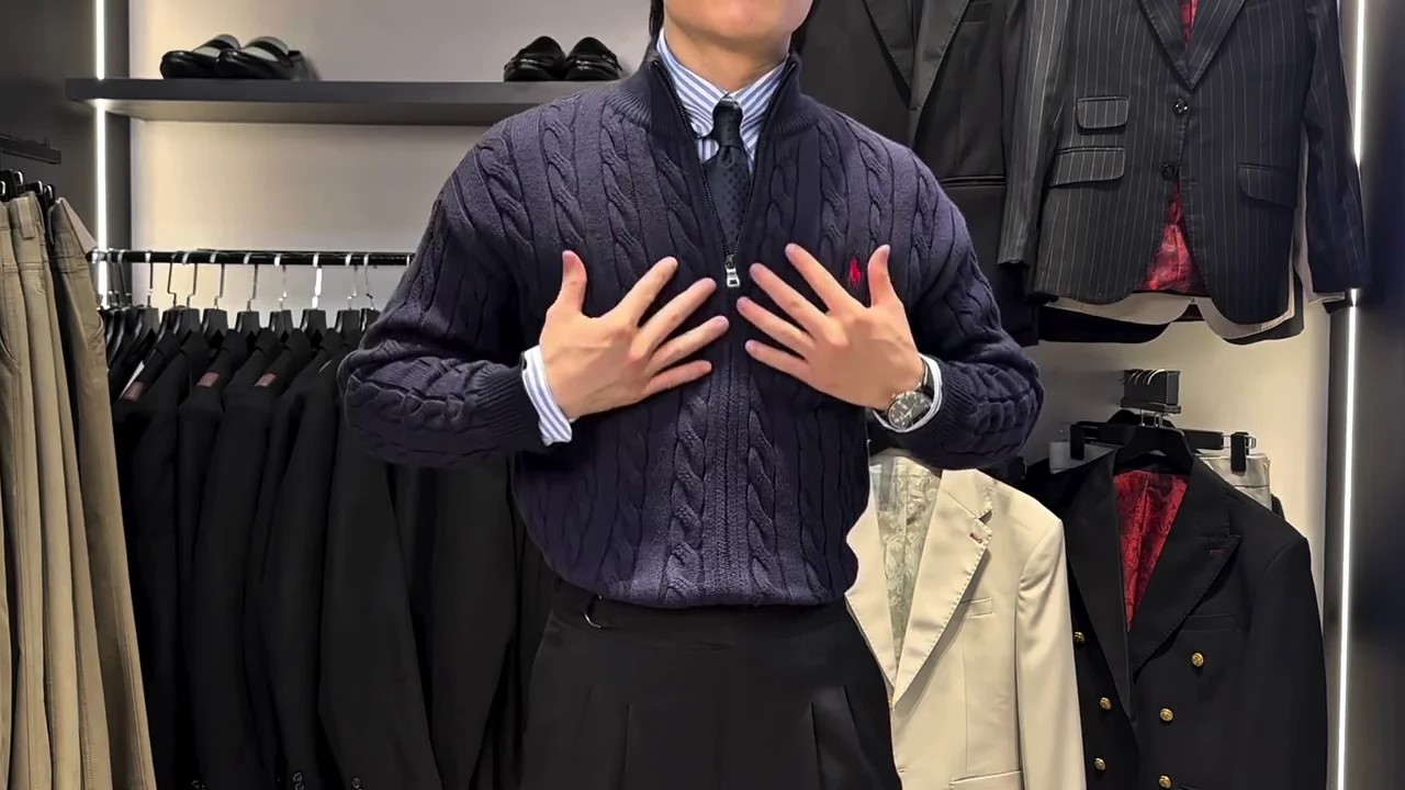men’s winter zip up cable knit sweater displayed in a premium clothing store setting. The sweater is worn over a formal shirt and tie, highlighting its versatile design that bridges smart and casual styling. The deep navy tone gives it a classic and sophisticated appeal, making it suitable for both everyday wear and refined occasions.