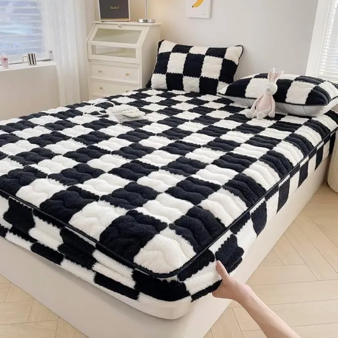 Milk Velvet Checkered Mattress Cover, Cow Flannel Fitted Sheet
