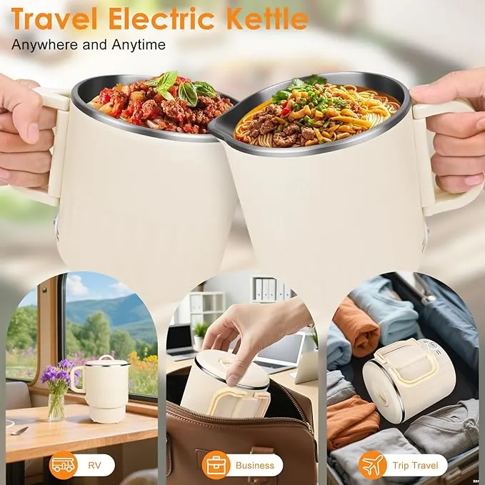 This portable travel electric kettle is designed for people who need hot food and beverages anytime, anywhere. With its compact and lightweight build, it is easy to carry in bags or luggage, making it perfect for travel, office use, hotel stays, camping, or dorm rooms. The modern mug-style design allows it to function as both a kettle and a cooking cup.