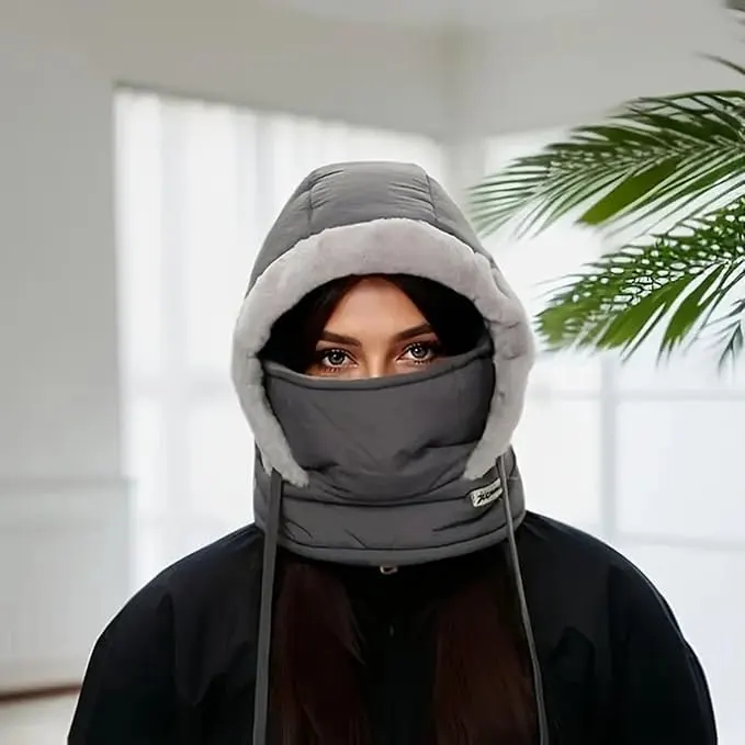 Designed to face harsh winter conditions with comfort and style, this all-in-one winter hood offers full head, neck, and face protection in a single thoughtfully engineered piece. The outer layer provides reliable resistance against cold winds, while the inside is lined with ultra-soft plush fabric that gently traps warmth without feeling heavy or restrictive. The integrated face cover shields the nose, cheeks, and chin, making it ideal for outdoor travel, commuting, or extended time in low temperatures. Its ergonomic shape fits naturally around the head, allowing free movement while maintaining consistent coverage, and the adjustable drawstrings ensure a secure, customized fit for different face shapes and preferences.