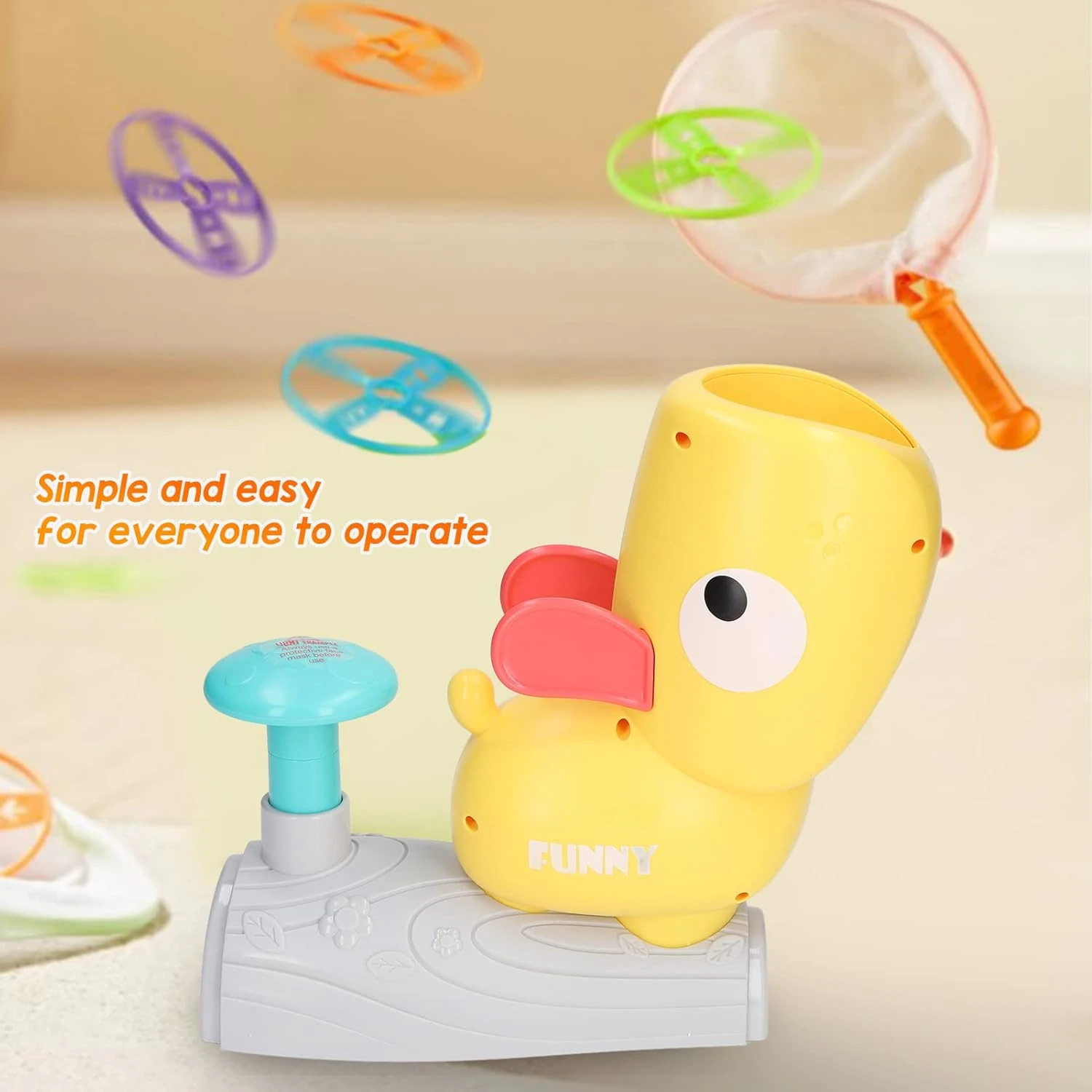 Bring excitement, movement, and laughter into playtime with this interactive flying disc launcher toy designed to keep kids active and engaged. Featuring a cute, child-friendly character design, this toy instantly attracts attention while encouraging energetic play. With a simple press-and-launch mechanism, colorful discs pop into the air, inviting children to jump, run, and catch. The smooth edges and lightweight structure make it easy for small hands to operate, turning every launch into a moment of surprise and joy.