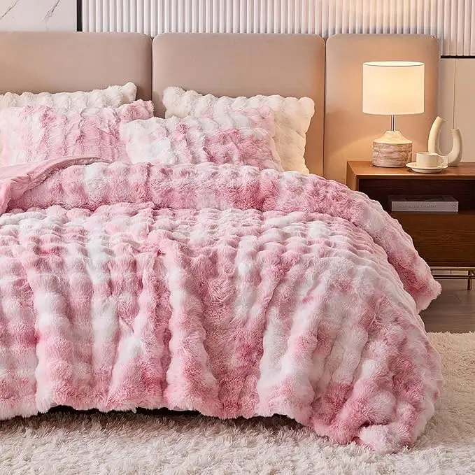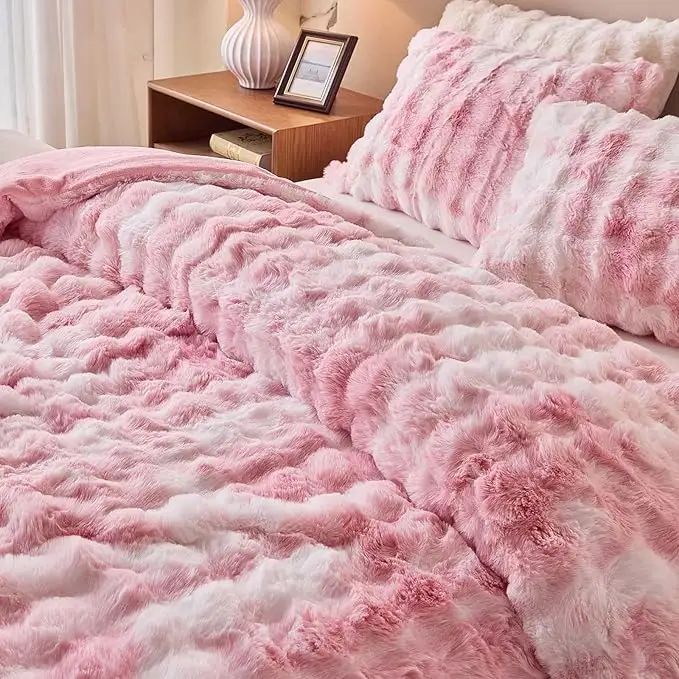 This plush comforter set is designed to bring instant warmth, softness, and elegance to your bedroom. Made with a rich, fluffy texture and a soothing two-tone pink pattern, it creates a calm and inviting atmosphere that feels as good as it looks. The thick, cloud-like surface gently wraps around you, making it perfect for relaxing after a long day while adding a premium decorative touch to your bed.