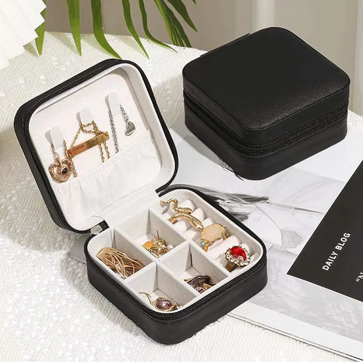This jewelry organizer also includes necklace hooks and an elastic pocket inside the lid, designed to keep chains and necklaces from tangling. The secure zipper closure ensures that all your valuables remain safely stored inside while protecting them from dust, moisture, and accidental spills.