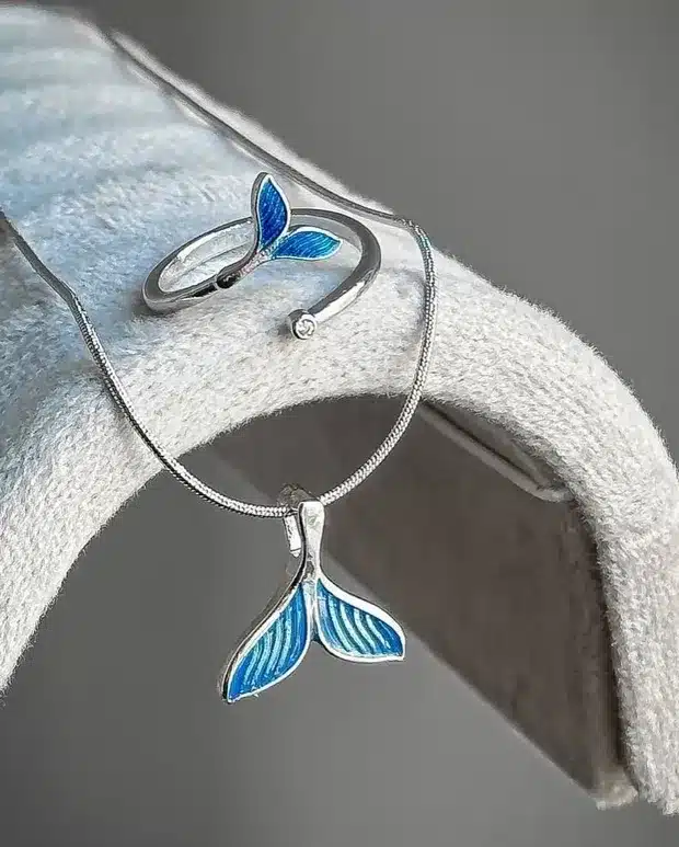 The set also includes a matching adjustable ring designed with the same whale tail motif. The adjustable feature ensures a comfortable fit for different finger sizes, making it easy to wear without worrying about exact measurements. The coordinated design between the necklace and ring creates a harmonious jewelry set that enhances your overall style.